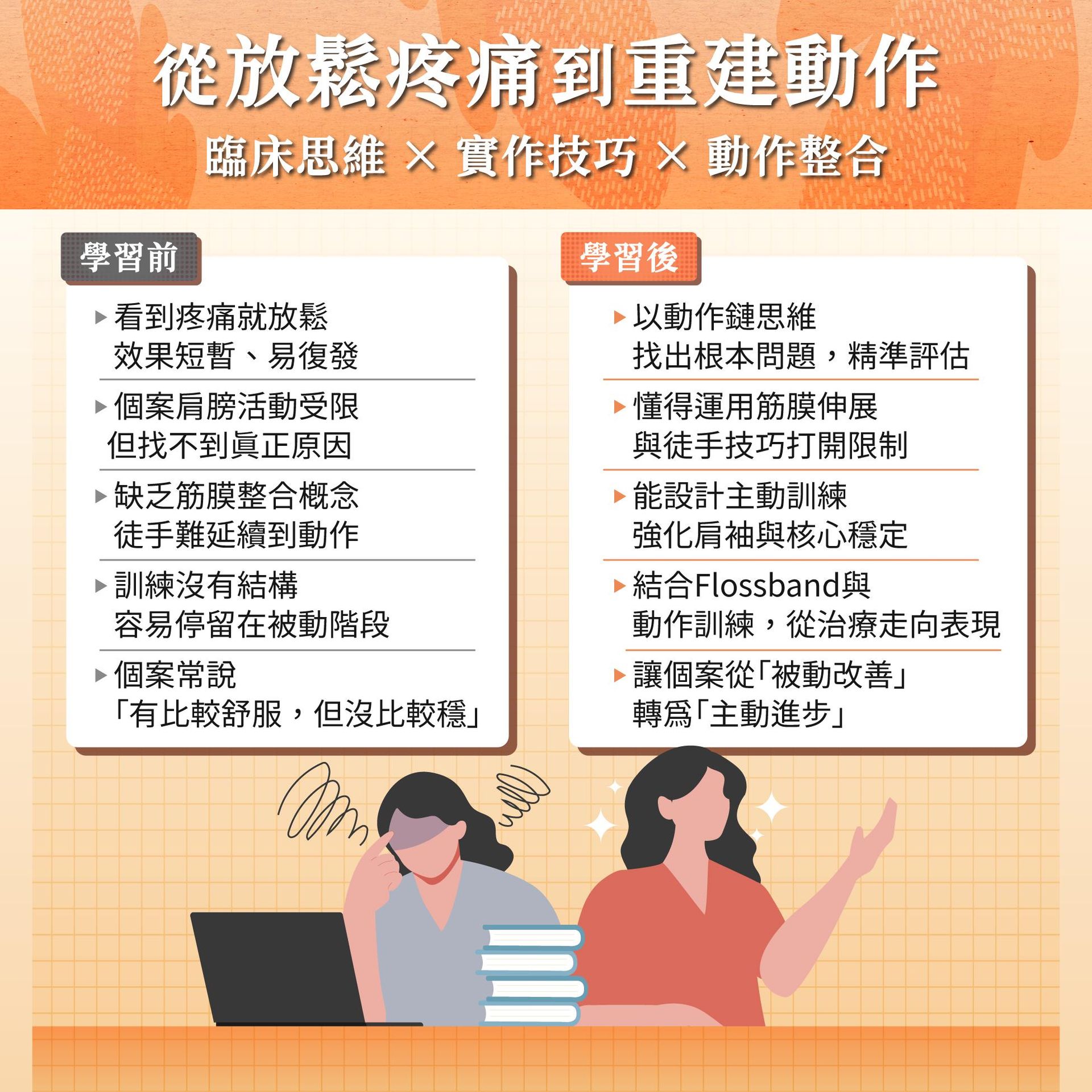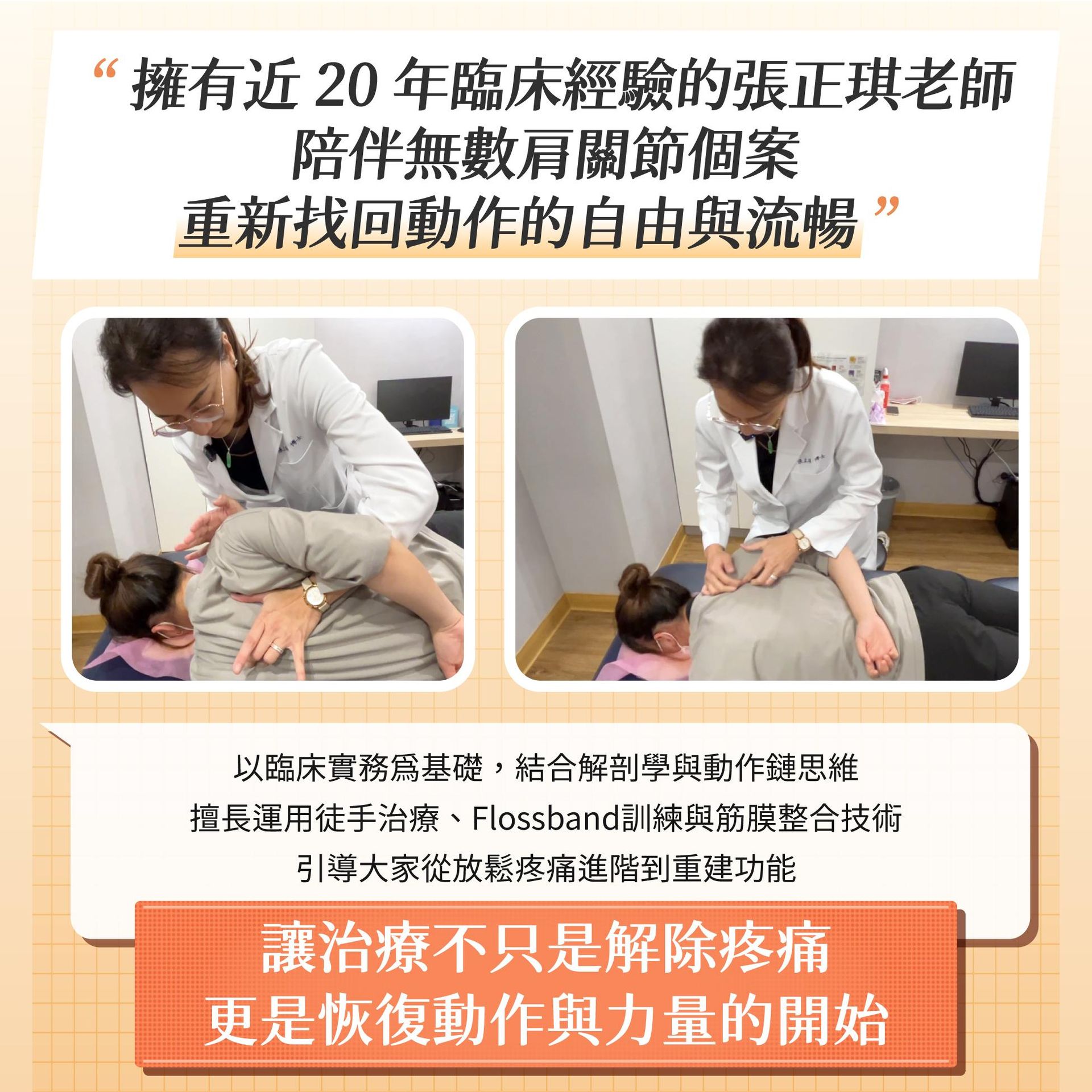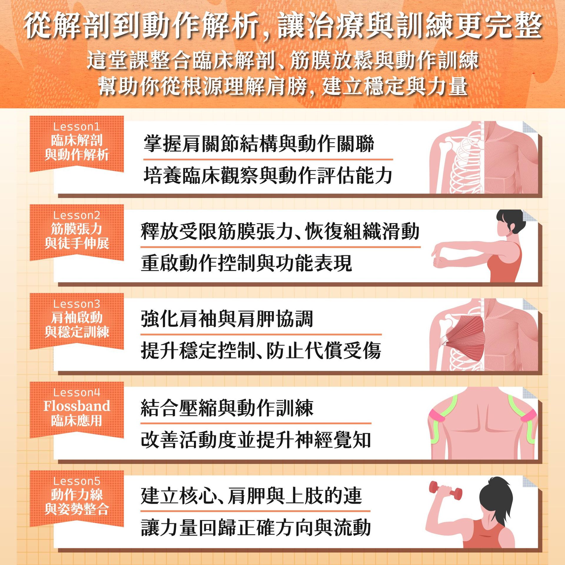 - 課程介紹:肩關節是影響日常功能與運動表現的重要關節,肩部問題常導致疼痛與動作障礙。肌筋膜理論強調,肌肉骨骼系統是生物力學中的整體,肌肉與結締組織網共同形成動作模式的基礎。運動物理治療結合運動醫學與教練體適能,幫助病人與運動員改善體態、姿勢與表現,減少疼痛及受傷風險。本課程上午聚焦臨床肩關節解剖學,並進行徒手實作與筋膜伸展,提升功能鏈思考。下午則使用Flossband進行肌筋膜放鬆,搭配重量水袋訓練上背與肩袖肌群的爆發力與穩定性,恢復肌肉功能,矯正姿勢,並緩解疼痛。課程涵蓋動作力線矯正、核心及肩關節訓練,提供臨床上多元的自費治療新選擇。