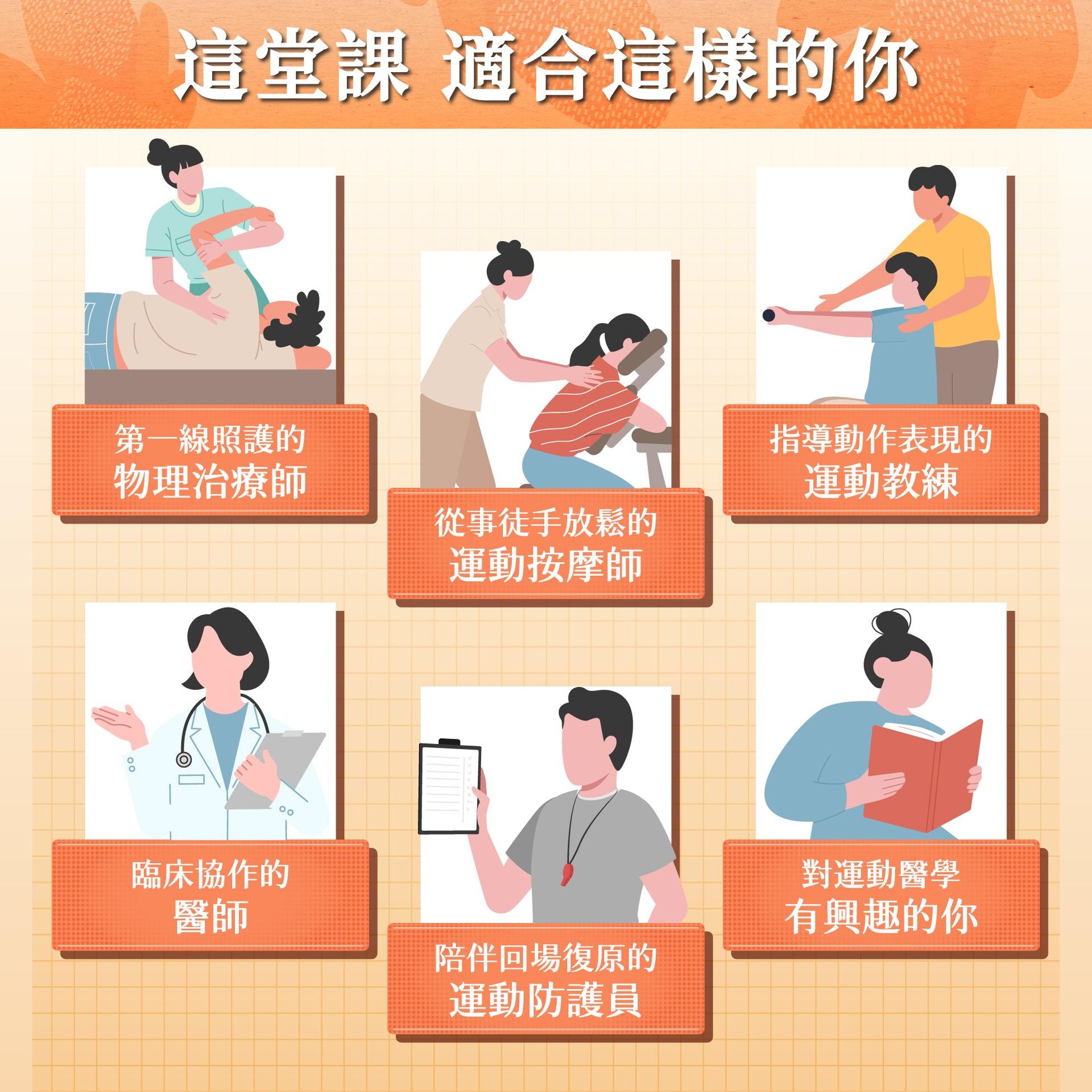 - 報名資格: 物理治療師、運動防護員、運動按摩師、醫師、運動員、運動教練等對運動醫學有興趣之人士