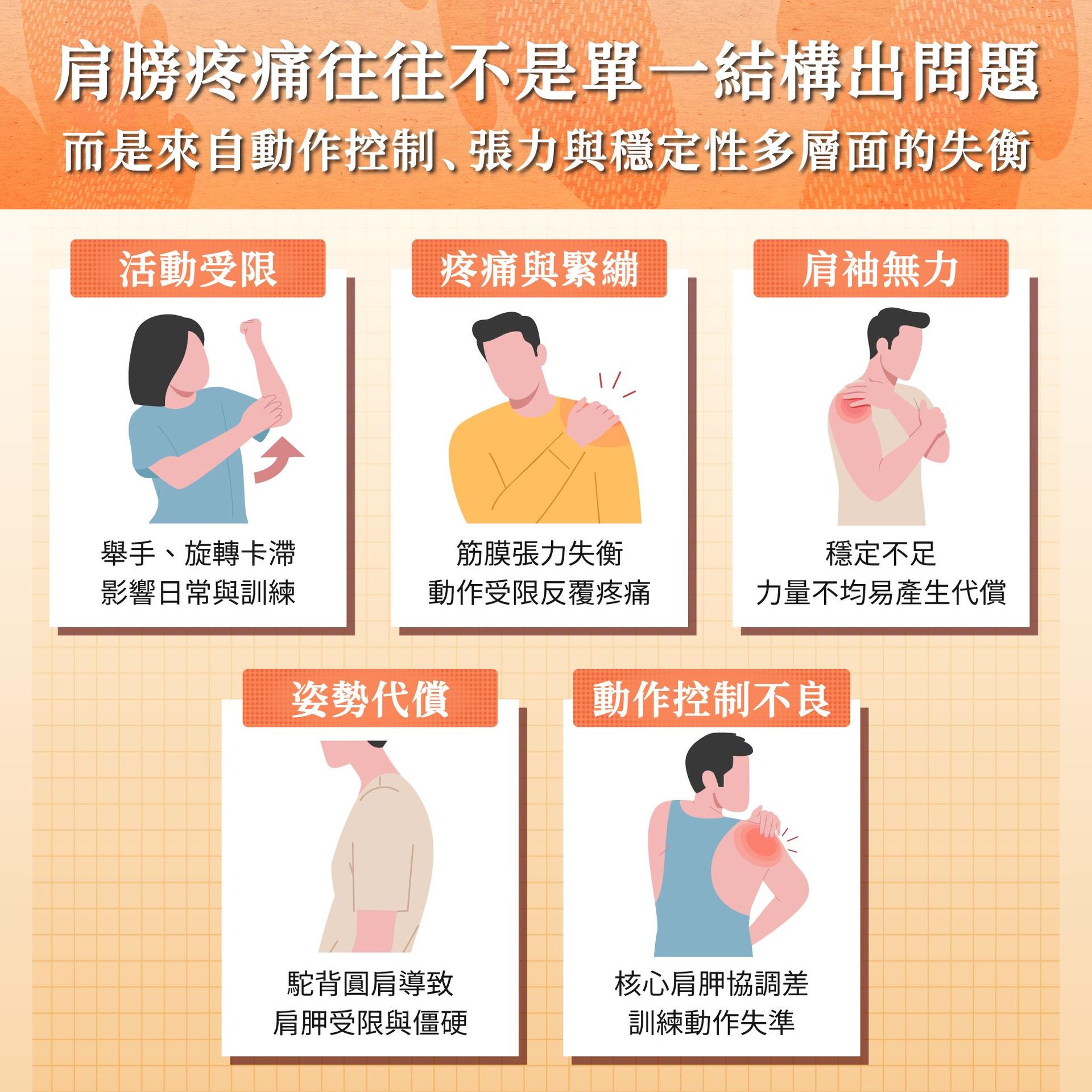 肩關節解剖學:重要肌肉介紹、神經與筋膜系統介紹、肩帶關節介紹、表面解剖學、影響肩部功能的結構與動作限制
