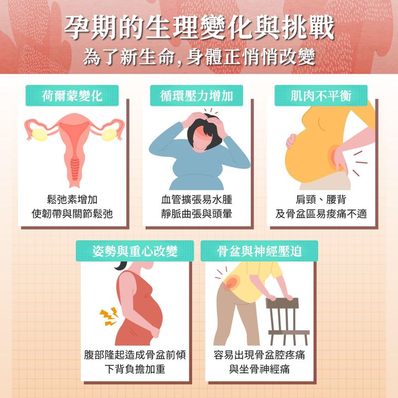 孕期的生理變化:懷孕期間賀爾蒙及身體變化、孕期禁忌症、孕期對生理結構的影響、孕期常見肌肉骨骼系統問題
