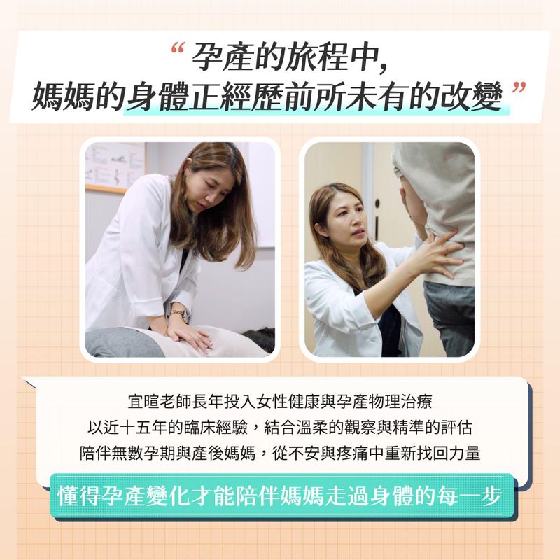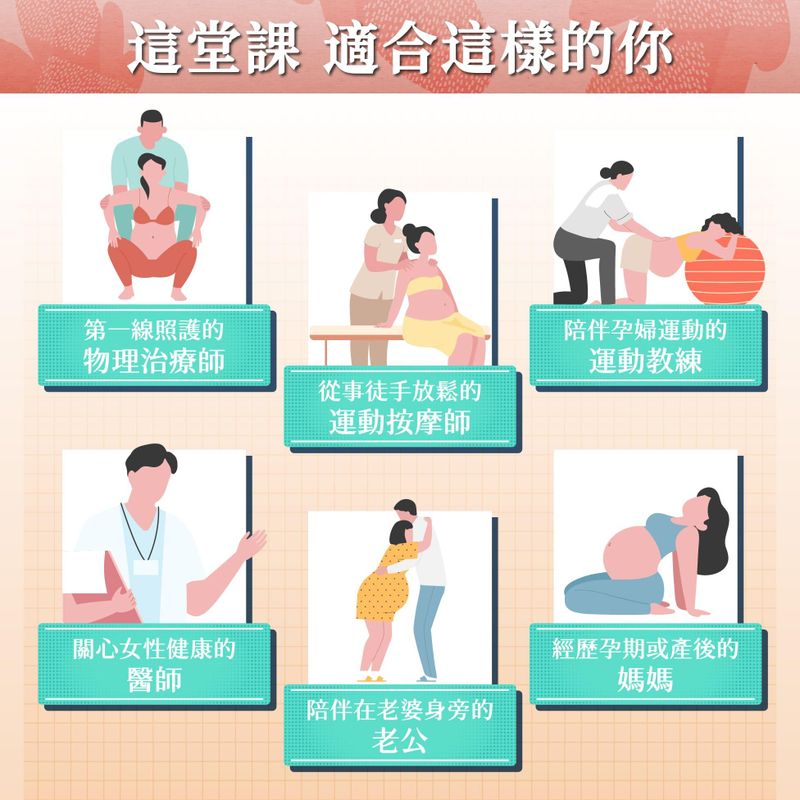孕期物理治療:孕期姿勢及骨盆帶評估觸診、孕期運動治療與骨盆帶疼痛的徒手治療、孕期媽媽適用的貼紮及輔具、胎兒分娩過程對媽媽骨骼肌肉的挑戰、分娩前的準備