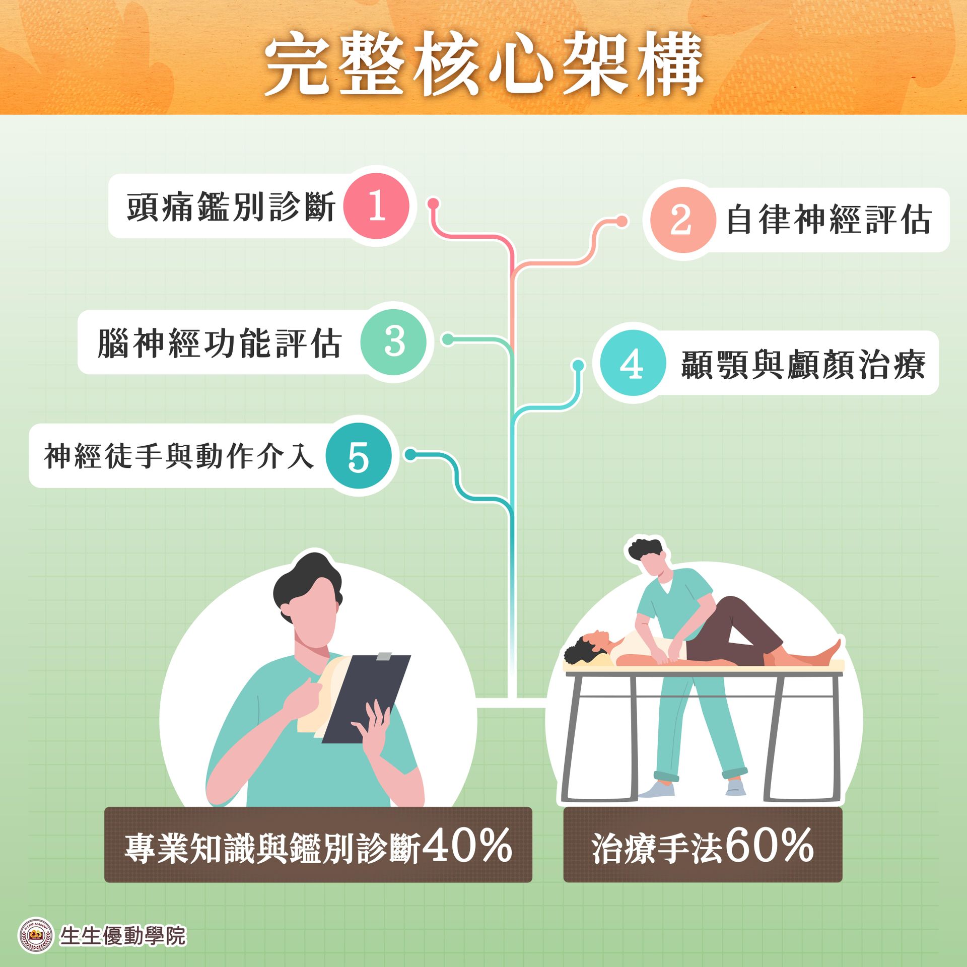 - 課程介紹:頭痛是一項高度複雜的臨床問題,涉及中樞與周邊神經系統、自律神經調控、顱顏結構、顳顎關節功能及肌筋膜張力等多重面向。若僅以局部症狀處理,往往難以達到穩定且長期的治療成效。本課程著重於臨床評估能力的深化與整合式治療策略的建立。課程內容比例為治療手法 60%、專業知識與鑑別診斷 40%,協助學員建立系統化的臨床思維,能夠精準辨識不同類型頭痛的成因,並選擇適切的治療介入方式。 課程將涵蓋頭痛的臨床分類與鑑別診斷、自律神經與腦神經功能檢測,以及顳顎關節、顱骨與功能神經學導向的整合治療手段。透過理論建構與大量實作練習,學員將能提升臨床判斷能力,強化治療策略的選擇邏輯,並優化整體療效。