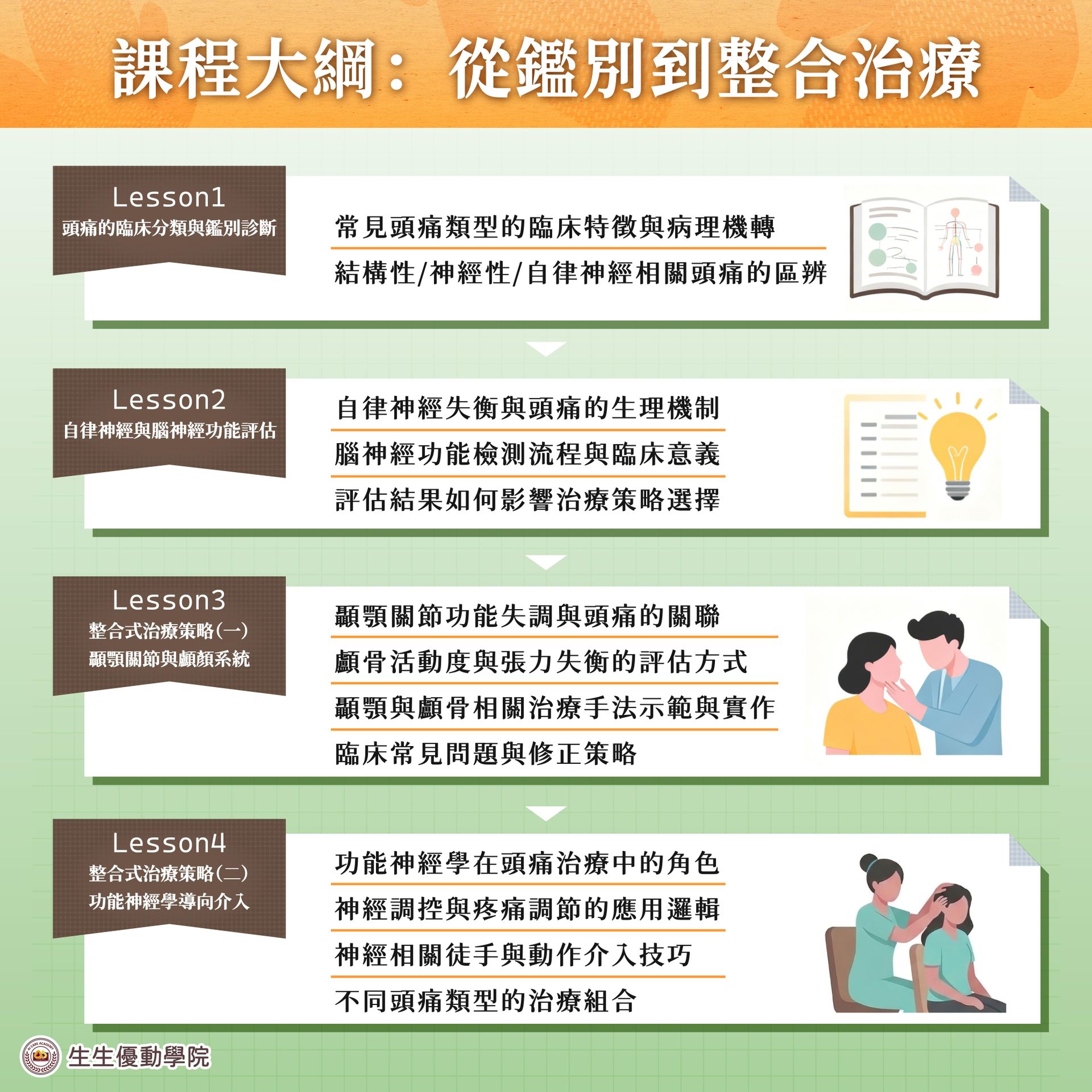 整合式治療策略(一)顳顎關節與顱顏系統:顳顎關節功能失調與頭痛的關聯、顱骨活動度與張力失衡的評估方式、顳顎與顱骨相關治療手法示範與實作、臨床常見問題與修正策略