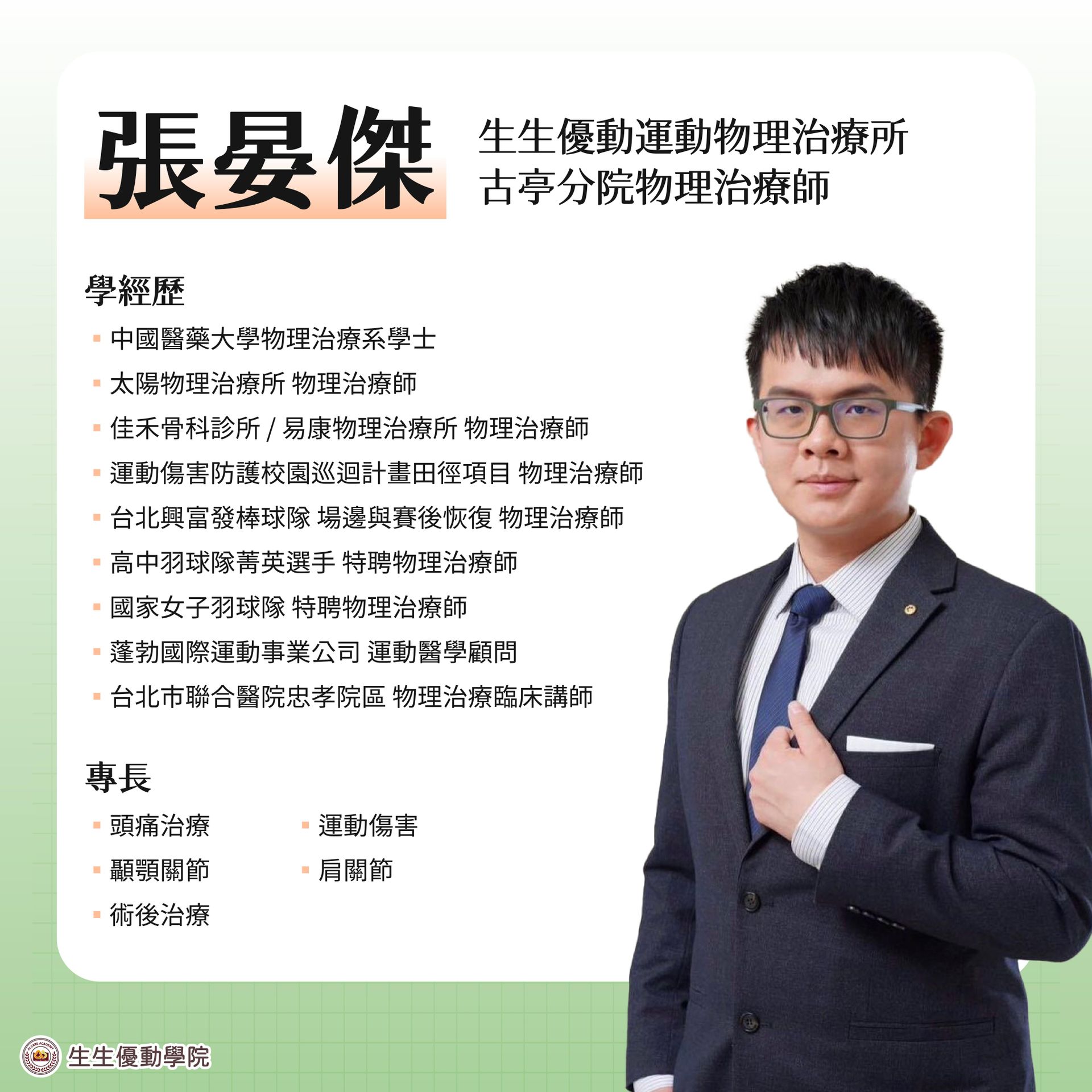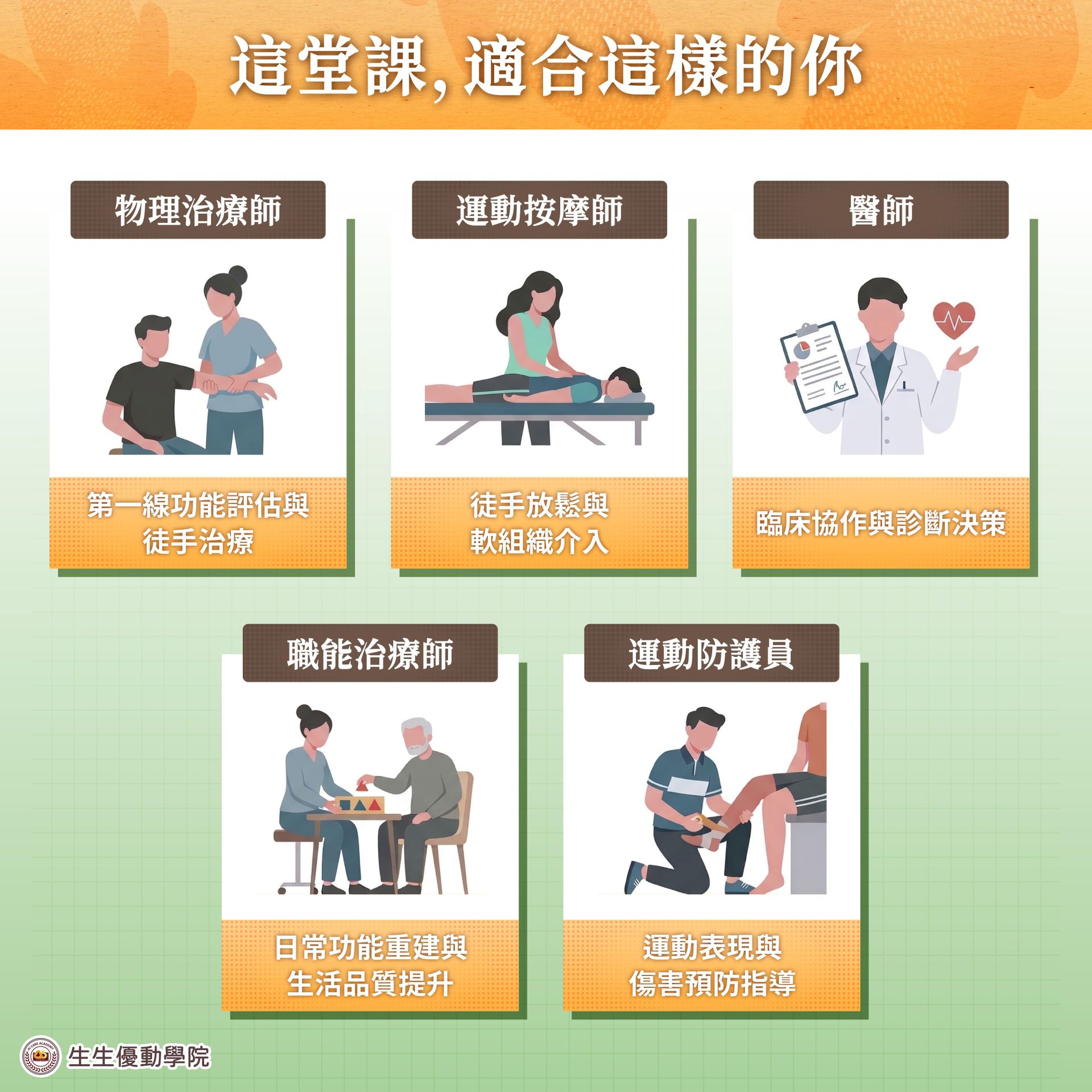- 報名資格:物理治療師、職能治療師、運動防護員、醫師、運動按摩師等相關領域從業者。