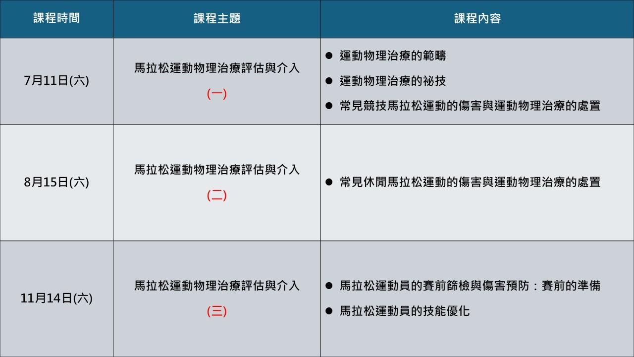 - 課程介紹:本課程以馬拉松運動為主軸,介紹運動物理治療的專業範疇與臨床應用,並分享實務操作中的技巧與處理。課程將解析競技與休閒跑者常見傷害類型,說明評估重點與物理治療處置方向。同時探討馬拉松跑者賽前篩檢與傷害預防,建立賽前準備與風險評估概念,並進一步延伸至跑步能力優化,協助跑者在安全基礎上提升表現。內容緊扣實務,強調評估、處置與表現整合。